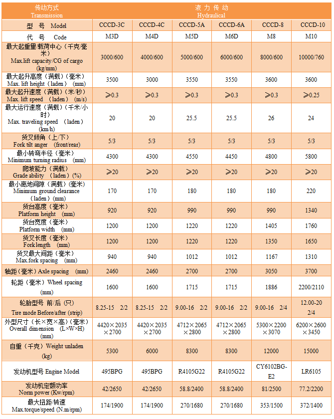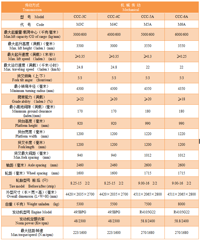Specification of Inner-Combustion-Engine Counter-Weight Forklift Truck